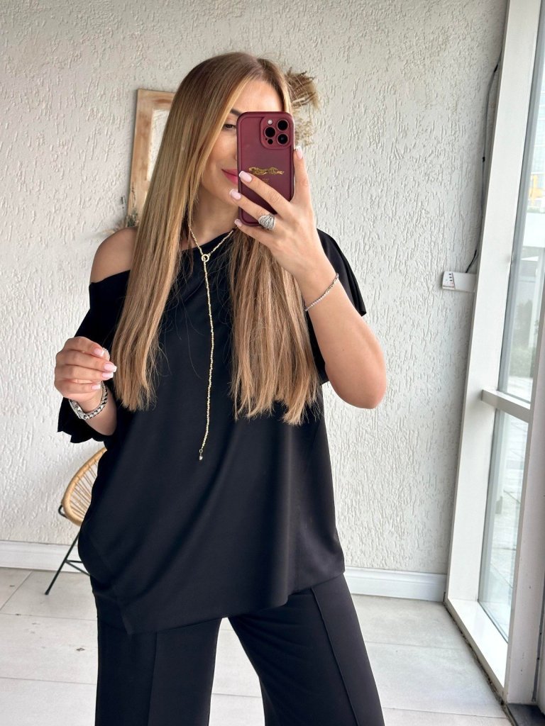 Kadın Tek Omuzdan Açık Geniş Kesim Viskon Iki Iplik Bluz Ve Pantolon Ikili Takım