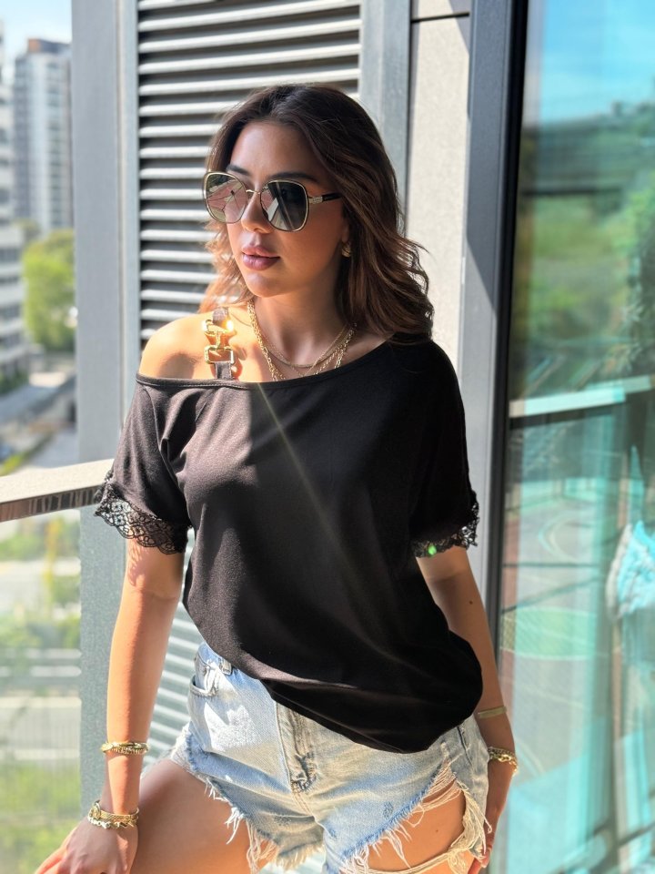 Kadın Tek Omuzu Askılı Kısa Kollu Toka Detaylı Dantelli Viskon Bluz