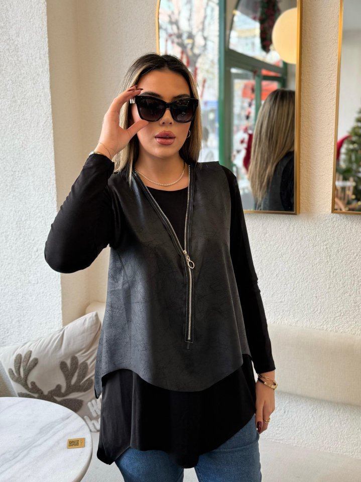 Kadın Uzun Kol Asimetrik Kesim Viskon Bluz Ve çatlak Deri Görünümlü Fermuar Detaylı Yelek Ikili Takım