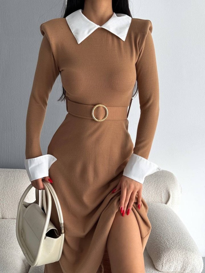 Kadın Uzun Kol Gömlek Yaka Ve Vatka Detay Kemer Dahil Midi Boy Elbise
