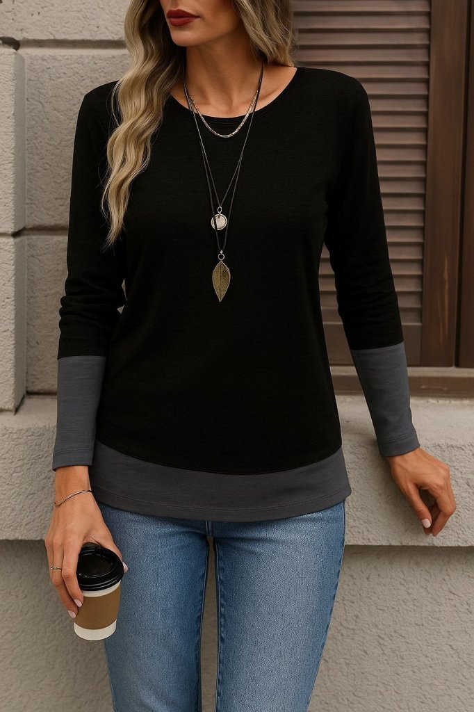 Kadın Uzun Kollu Açık Yuvarlak Yaka Blok Renkli Viskon Bluz
