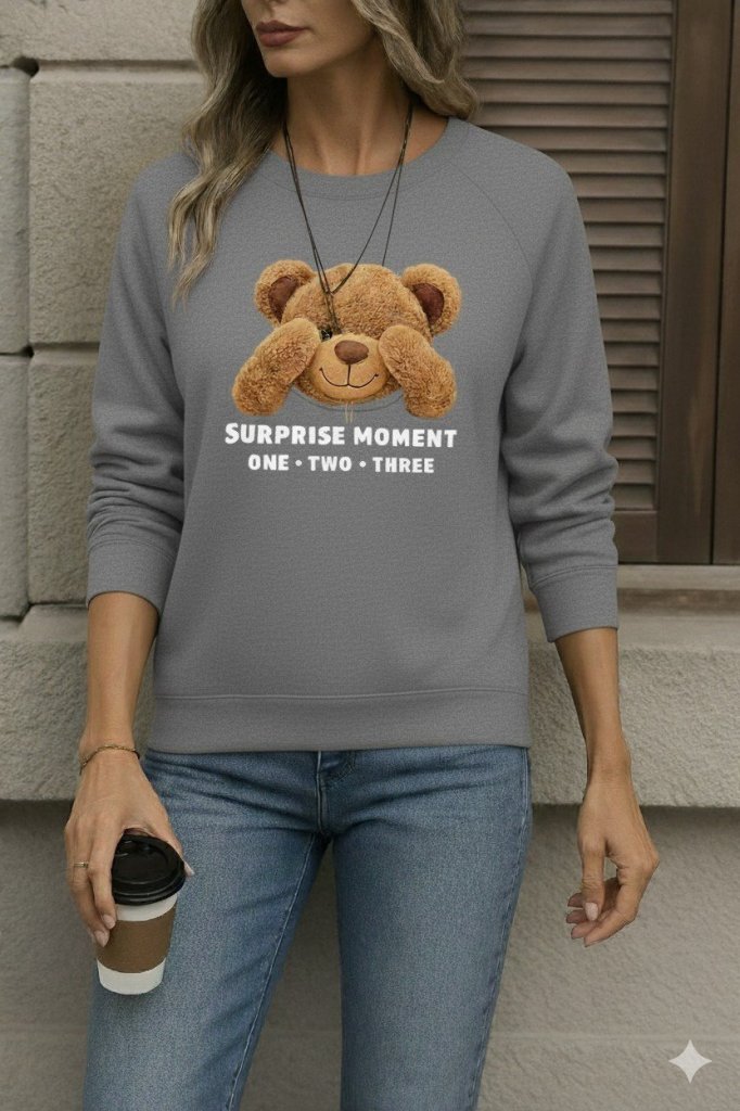 Kadın Uzun Kollu Bisiklet Yaka Ayıcık Desenli Viskon Iki Iplik Bluz
