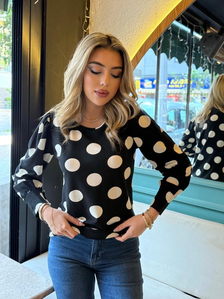 Kadın Uzun Kollu Bisiklet Yaka Kollar Geniş Kol Ağzı Manşetli Iki Düğmeli Detay Krep Bluz