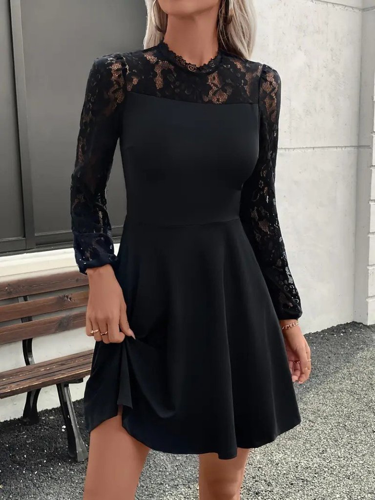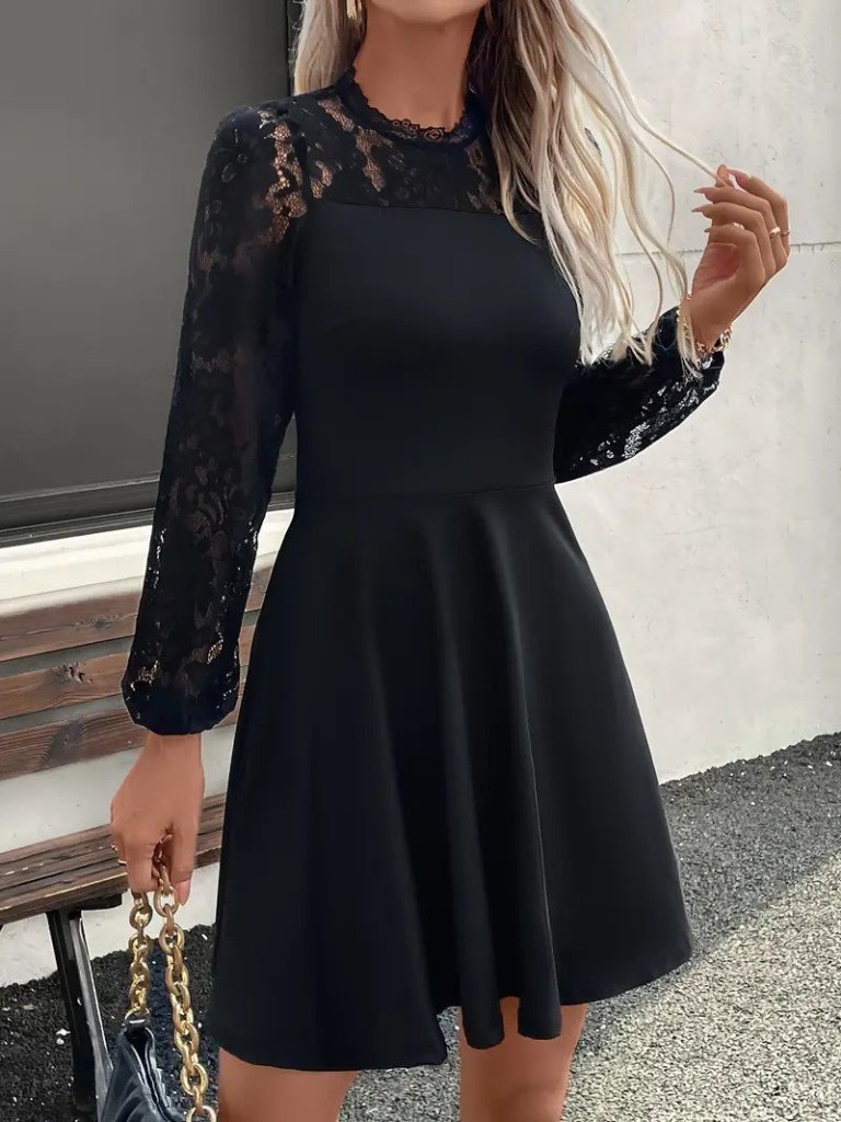 Kadın Uzun Kollu Dantelli Kloş Mini Ithal Krep Elbise