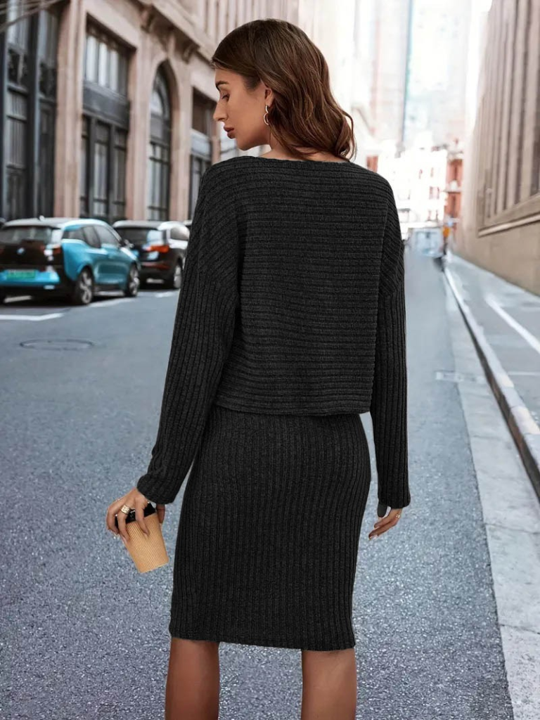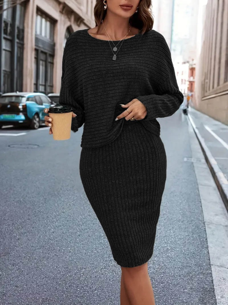Kadın Uzun Kollu Iki Yanı Açık Yaka Detaylı Bluz Ve Etek şardonlu Kaşkorse Ikili Takım