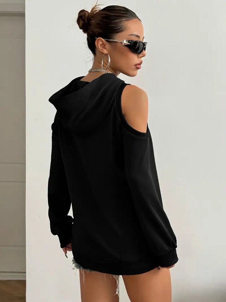 Kadın Uzun Kollu Kapşonlu Omuzlardan Açık Viskon Iki Iplik Bluz