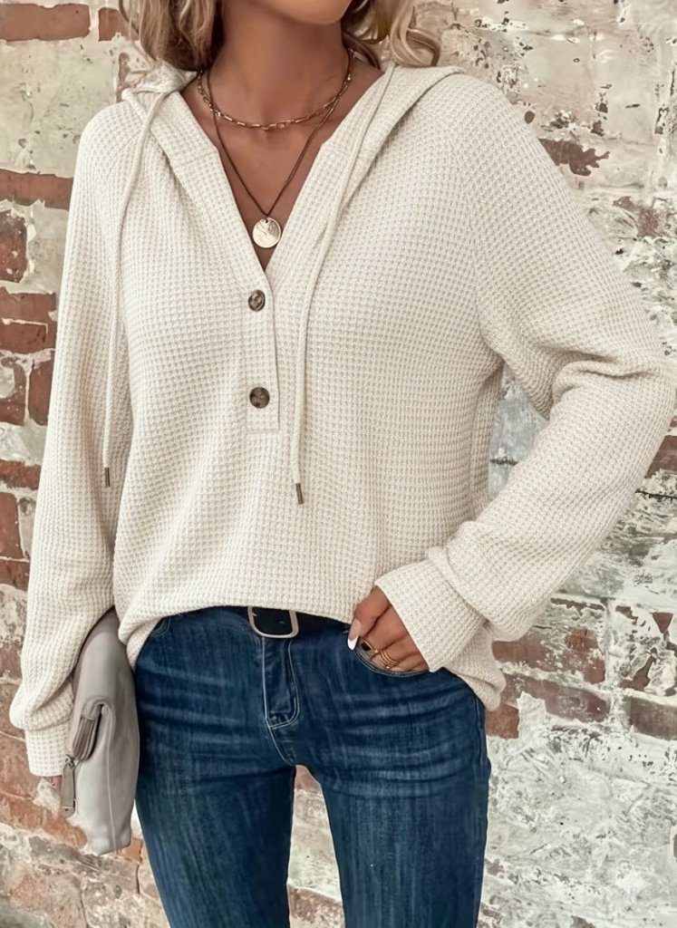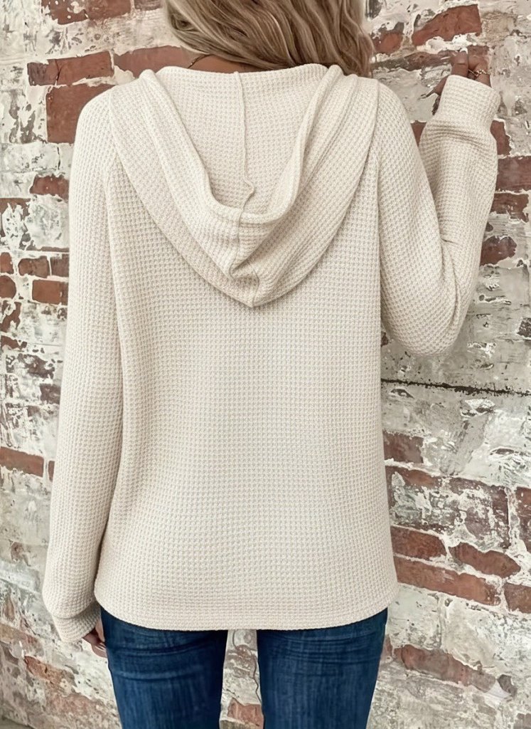 Kadın Uzun Kollu Kapşonlu önü Düğmeli Ve Bağcıklı Waffle Bluz