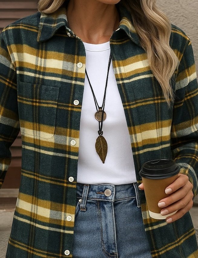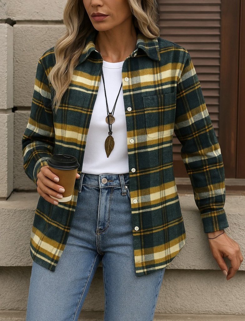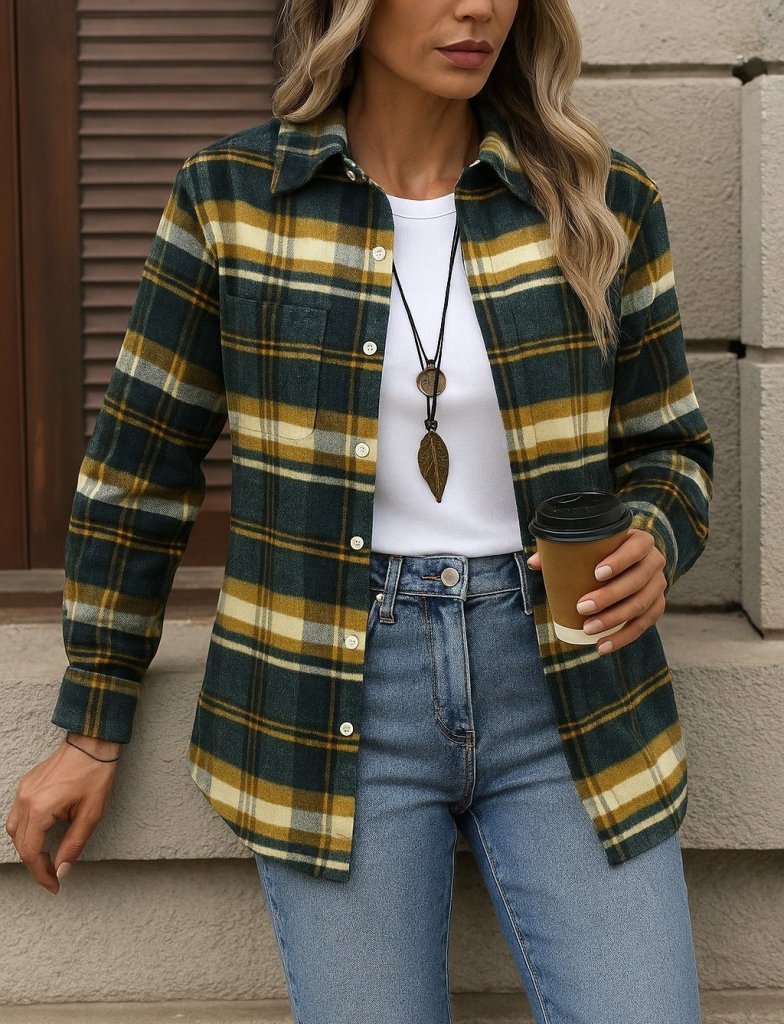 Kadın Uzun Kollu Kare Desenli önden Düğmeli Dokuma Gömlek