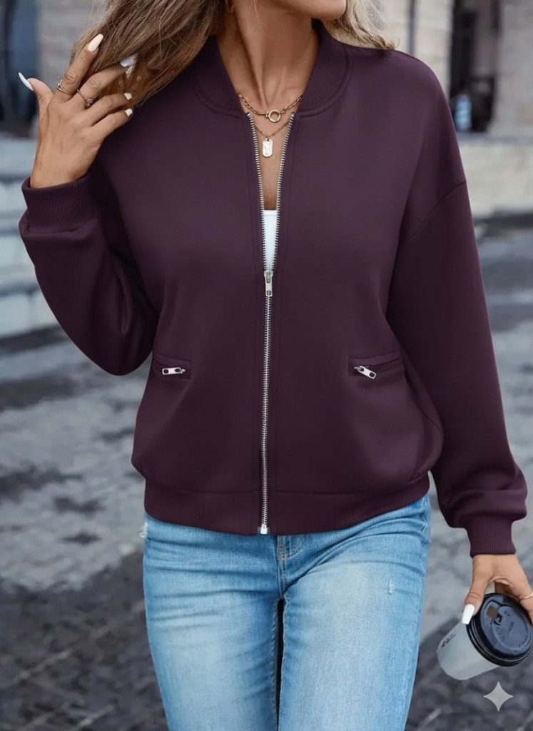 Kadın Uzun Kollu önden Fermuarlı Cepli Modal Mürdüm Ceket