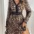 Kadın Uzun Kollu V Dantel Yakalı Leopar Desenli Modal Mini Elbise