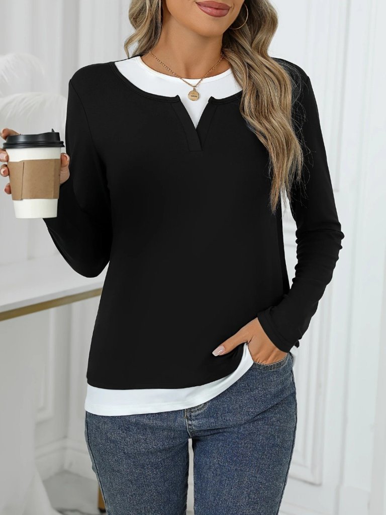 Kadın Uzun Kollu V Yakalı çift Renkli Viskon Iki Iplik Bluz