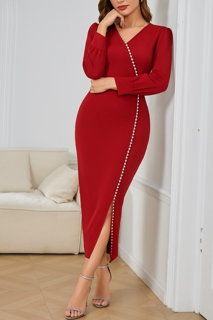 Kadın Uzun Kollu V Yakalı Yırtmaçlı Taşlı Uzun Ithal Krep Elbise