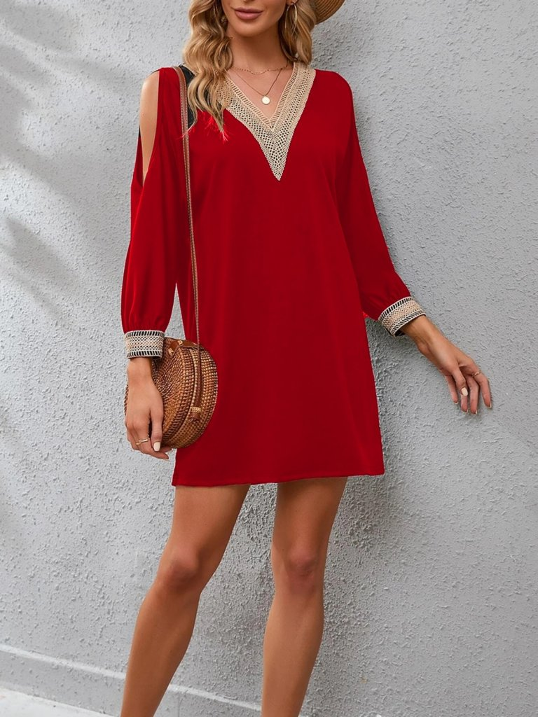 Kadın Uzun Kollu Yaka Ve Kol Manşet Güpürlü Detay Krep Mini Boy Elbise
