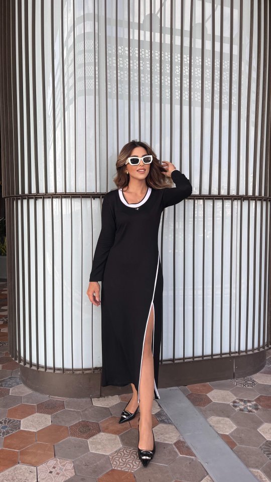 Kadın Uzun Kollu Yuvarlak Ribana Yaka Yırtmaçlı Uzun Viskon Iki Iplik Elbise