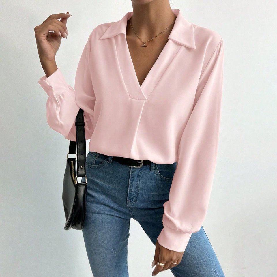 Kadın V Yaka Uzun Kollu Mosskrep Kumaş Bluz