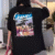 Kadınlar İçin Geniş Kesim Tişört – Kısa Kollu, Bol Kesim, Manzaralı Okyanus Baskı, Günlük Yazlık Üst, Siyah- Siyah