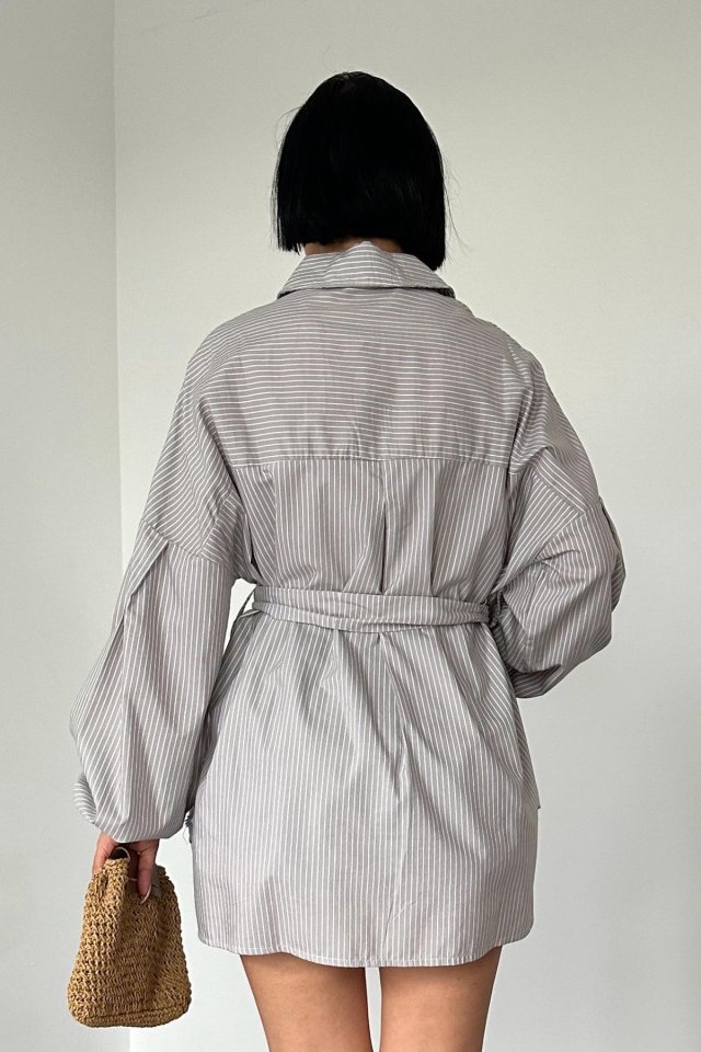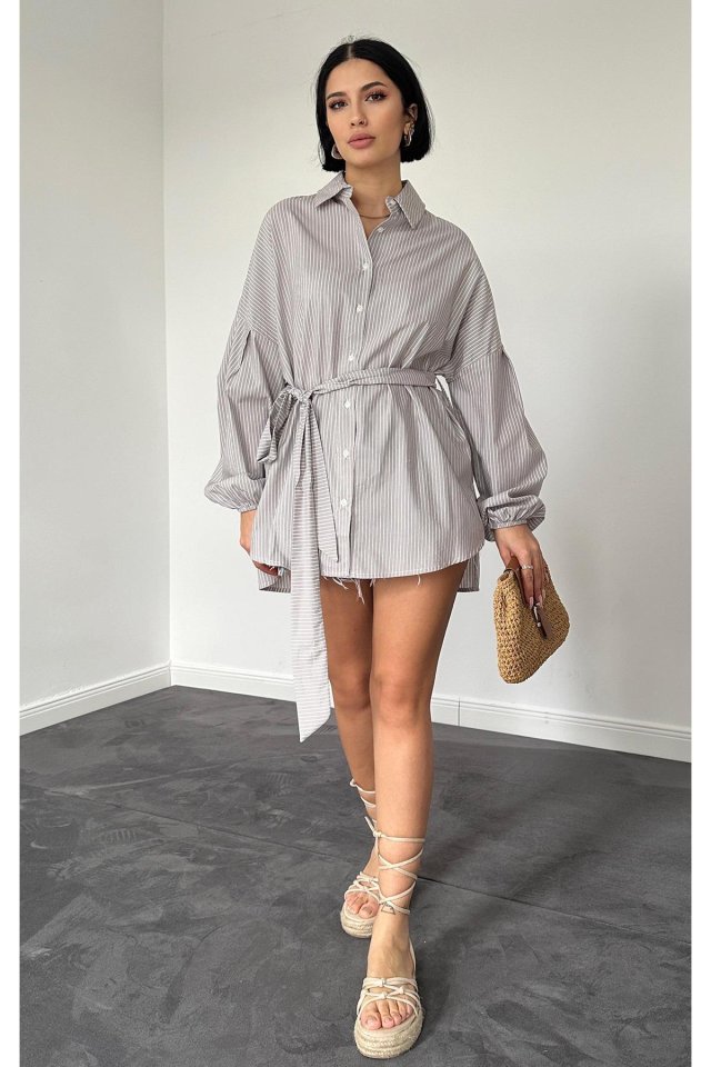 Kahverengi Çizgili Poplin Kuşaklı Gömlek