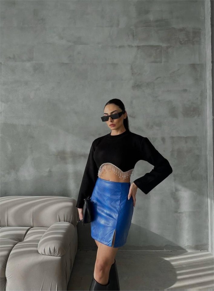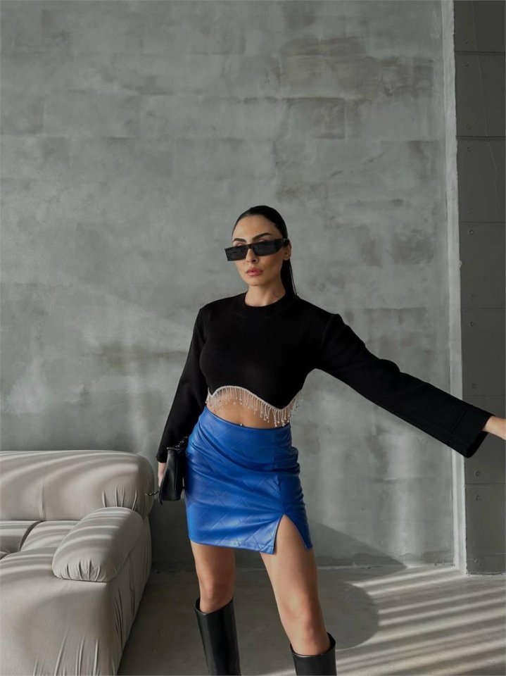 KAPİTONE DERİ ETEK YIRTMAÇLI – Saks