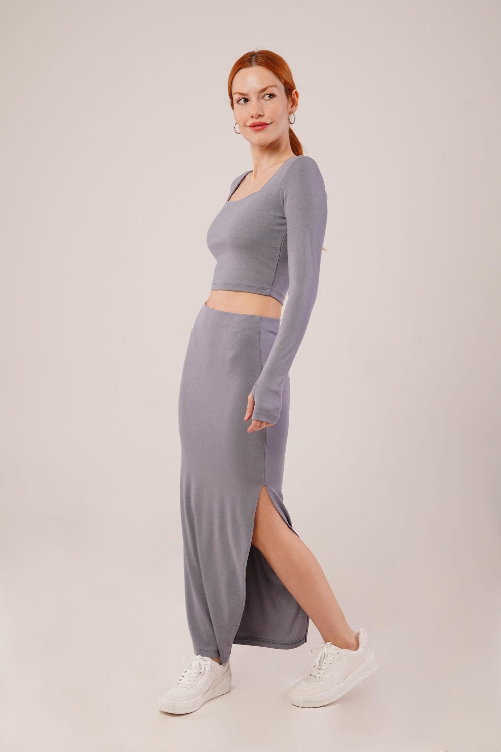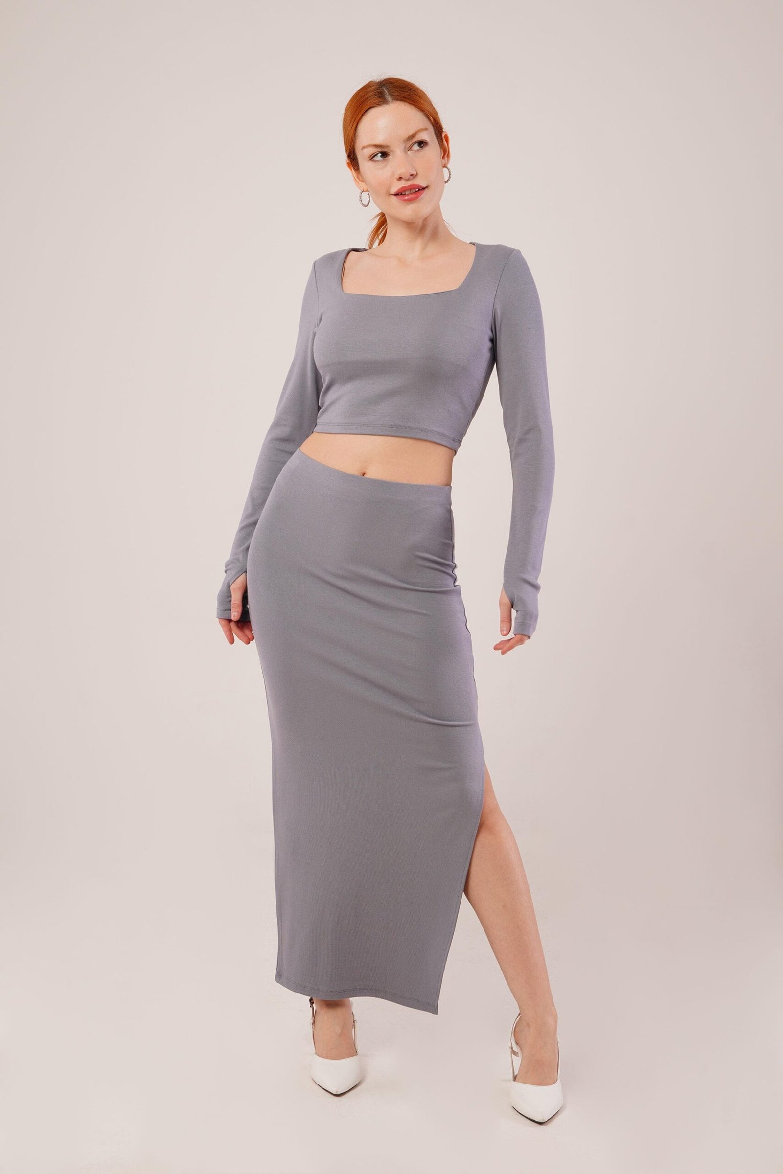 Kare Yaka Bluz Ve Yırtmaç Detaylı Etek İkili Gri Takım