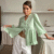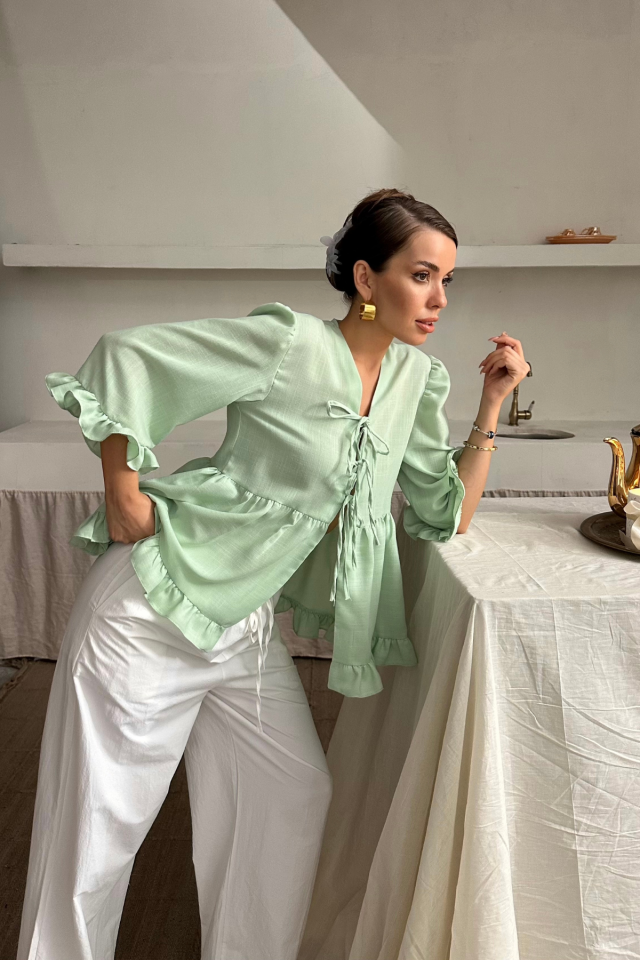 KETEN BLUZ ÖNDEN BAĞLAMALI FIRFIR DETAYLI – Yeşil