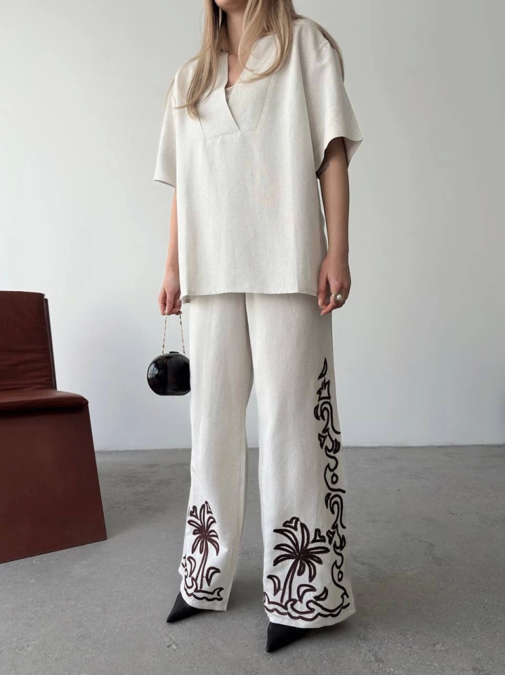 Keten Kısa Kolu V Yaka Bluz Pantolon Ikili Takım- Beyaz