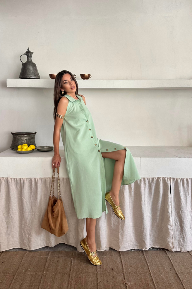 KETEN ÖNDEN DÜĞMELİ KOLSUZ GÖMLEK YAKA ELBİSE – Mint
