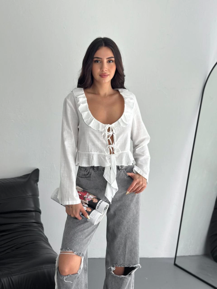Keten Uzun Kol Bağacık Detaylı Bluz – Beyaz