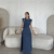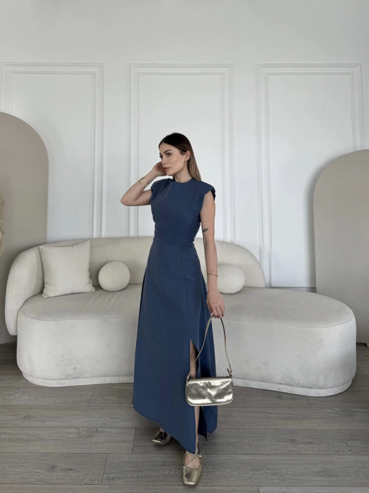 Keten Yandan Yırtmaçlı Uzun Sıfır Kolsuz Elbise – Mavi