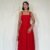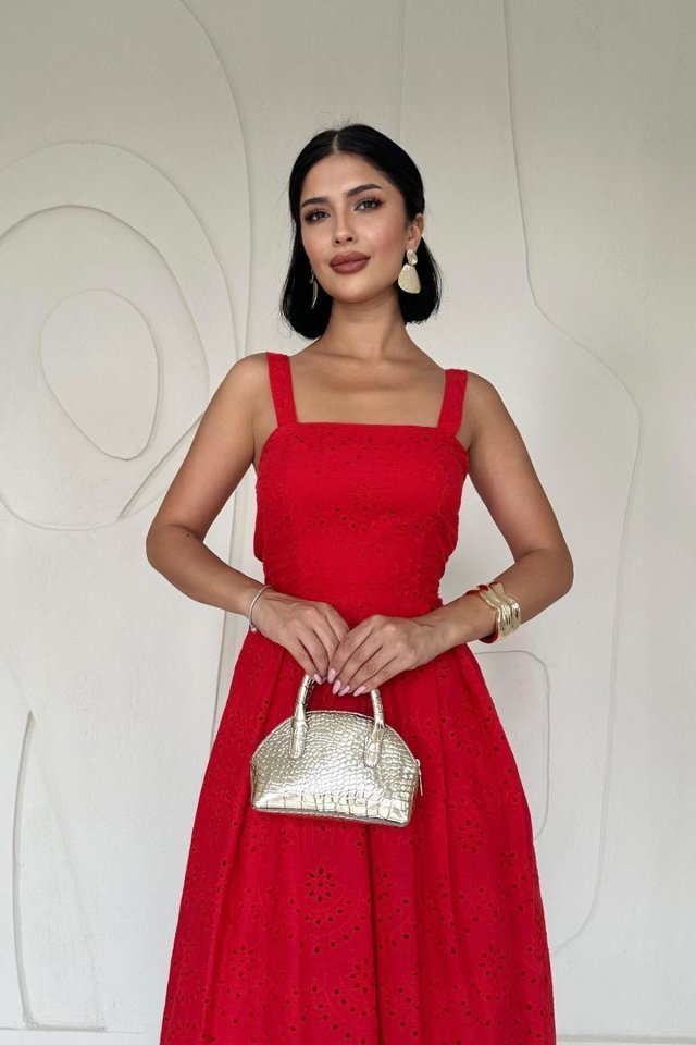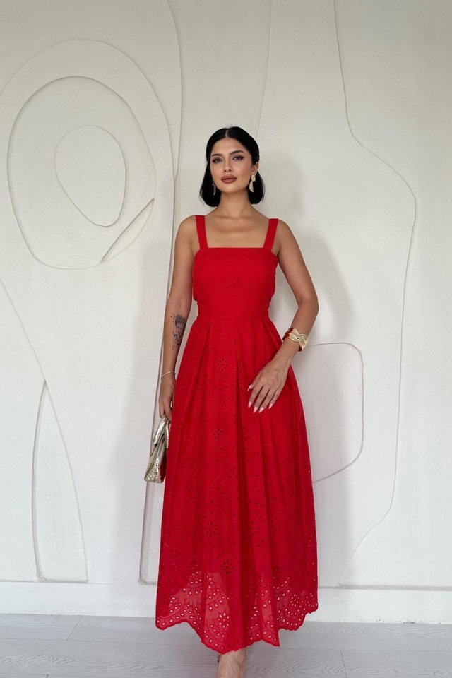 Kırmızı Askılı Aparatlı Brode Elbise
