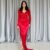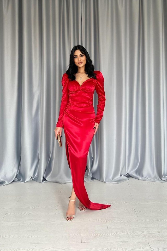 Kırmızı Göğsü Kuplu Yırtmaçlı Elbise
