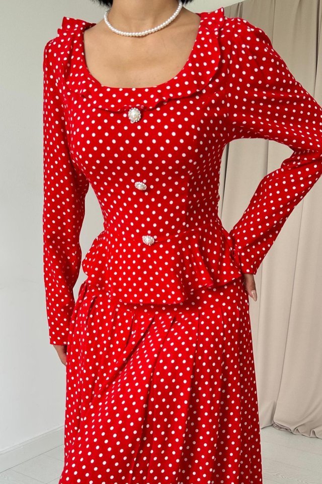 Kırmızı Puantiye Desenli Volanlı Elbise