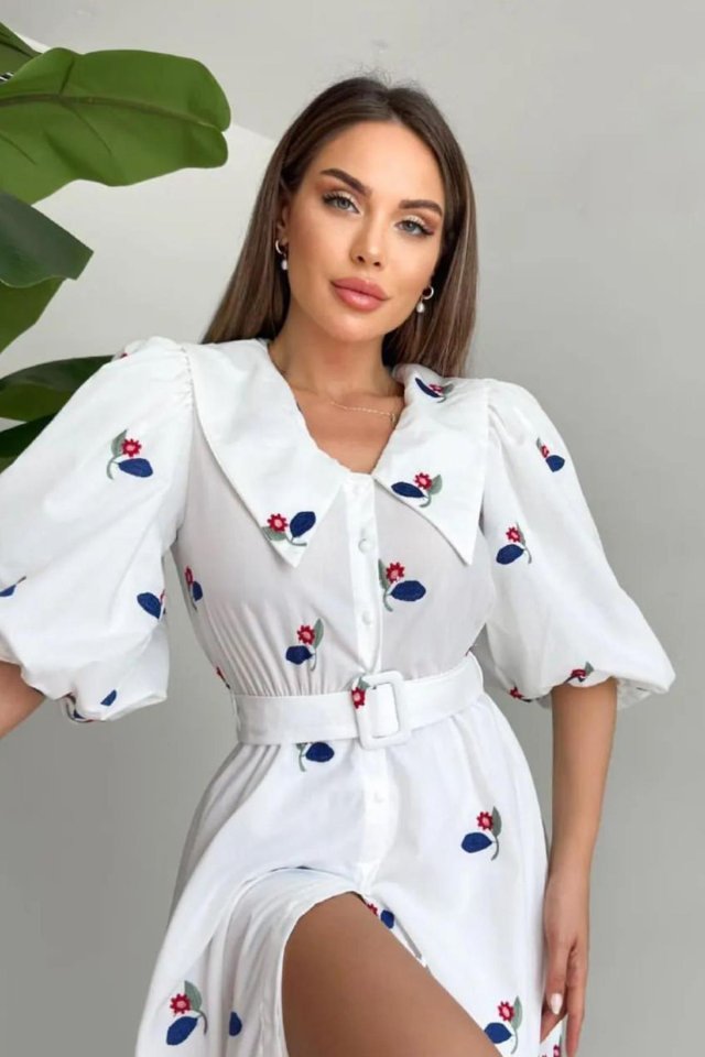 Kırmızı Yakası Çiçek Motifli Kemerli Elbise