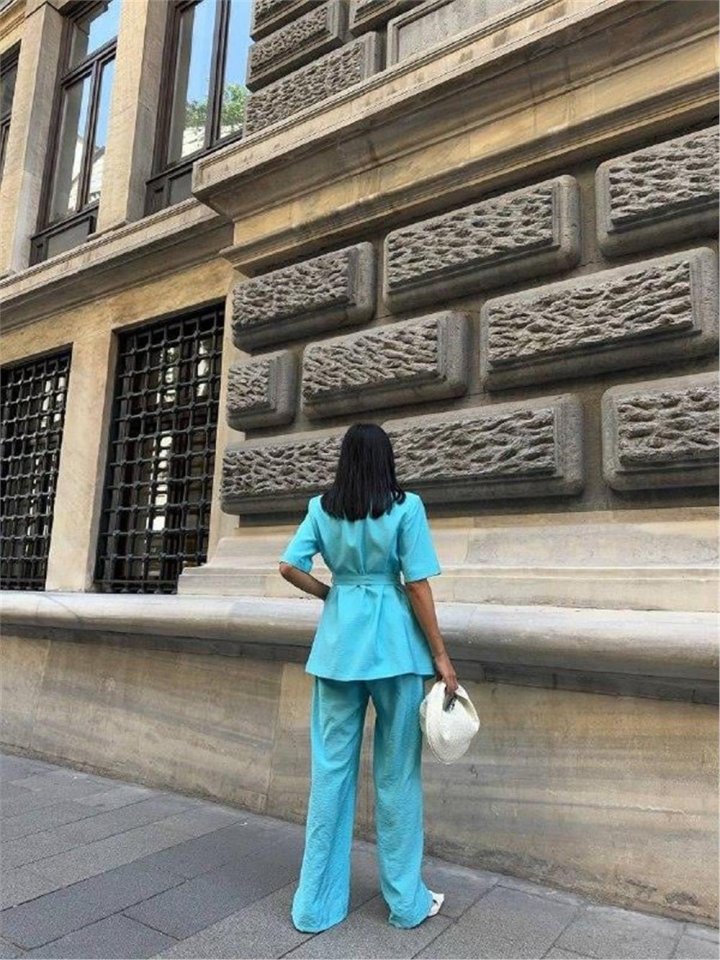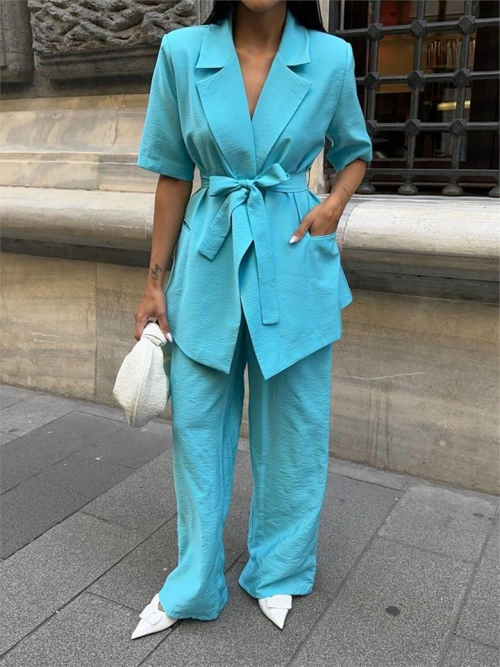 KISA KOL BAĞLAMA DETAYLI CEKET-PANTOLON TAKIM – Mavi