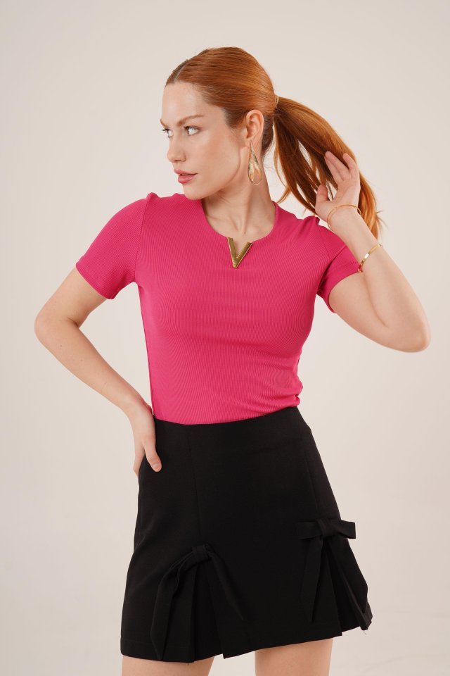 Kısa Kollu Yaka Detaylı Kaşkorse Fuşya Bluz