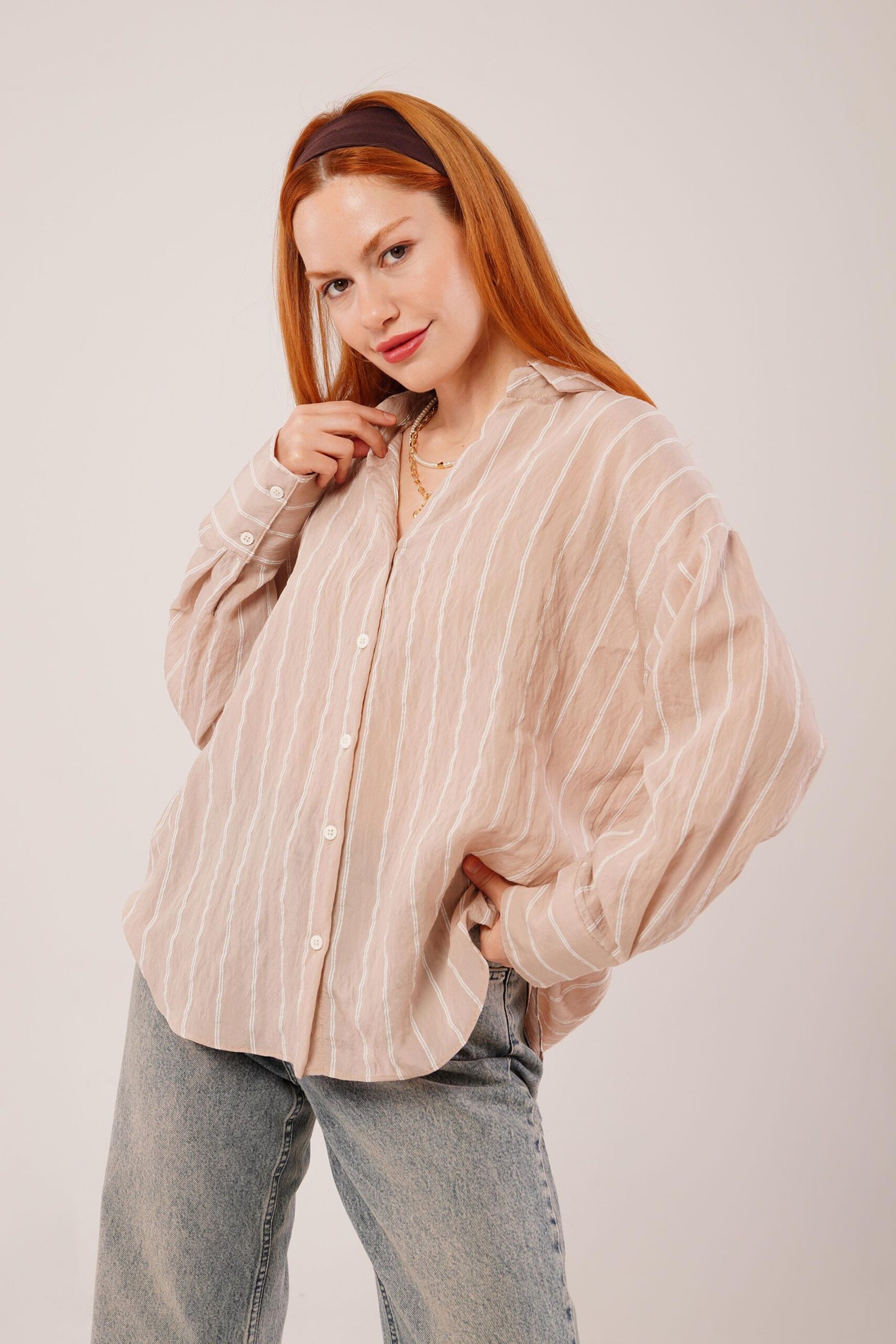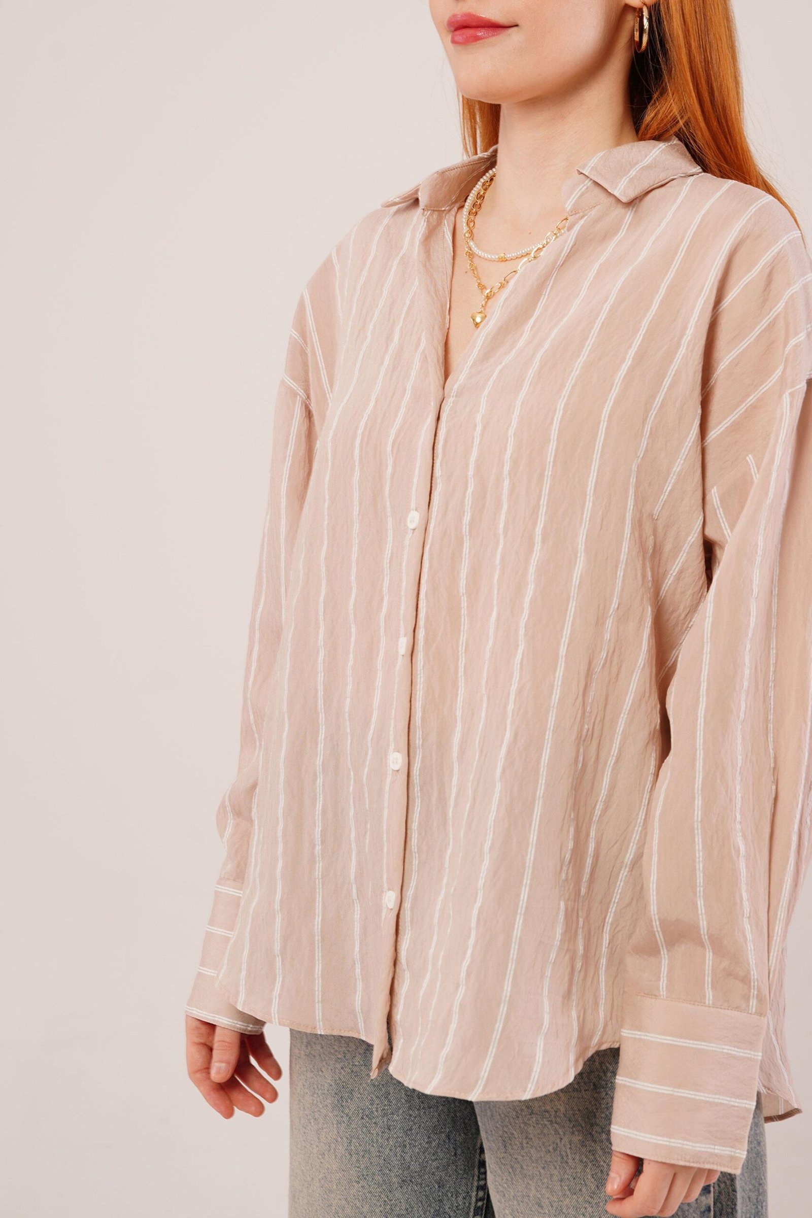 Kol Düğmeli Çizgili Bej Gömlek