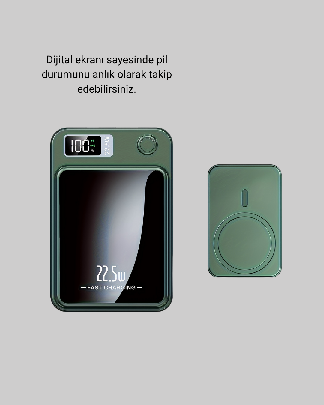 Cihazlarınızı her an güçlü tutmak artık çok kolay! MagSafe Powerbank 10.000 mAh Kablosuz ve Dijital Ekranlı Hızlı Şarj Cihazı, gelişmiş teknolojisiyle şarj deneyimini yeniden tanımlıyor.10.000 mAh yüksek kapasiteli batarya, birden fazla cihazı arka arkaya şarj edebilme gücüne sahiptir.Kablosuz şarj özelliği, kablo karmaşasına son verirken MagSafe uyumlu manyetik tasarımı ile telefonunuza sıkıca tutunur. Bu sayede hareket halindeyken bile şarj bağlantısı kopmadan güvenle kullanabilirsiniz.22.5W hızlı şarj desteği, cihazlarınızı dakikalar içinde şarj eder. Bu güçlü teknoloji, yoğun yaşam temposuna ayak uydurmanızı sağlar.Üzerindeki akıllı dijital ekran, pil seviyesini net şekilde gösterir; böylece enerji miktarınızı her zaman takip edebilirsiniz.Kompakt ve hafif tasarımı, günlük yaşamda taşıma kolaylığı sunar. Şık metalik yüzeyi, modern bir görünüm kazandırırken, dayanıklı dış kaplaması uzun süreli kullanım sağlar.Hem performans hem estetik açısından fark yaratan MagSafe Powerbank 10.000 mAh Kablosuz ve Dijital Ekranlı Hızlı Şarj Cihazı, akıllı kullanıcıların vazgeçilmezi olacak!