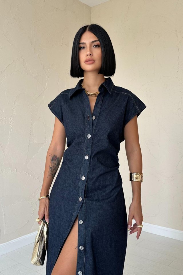 Mavi Kolsuz Vatkalı Elbise