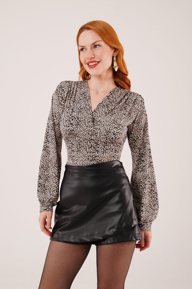 Mini Leopar Desen V Yaka Bluz