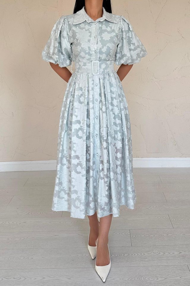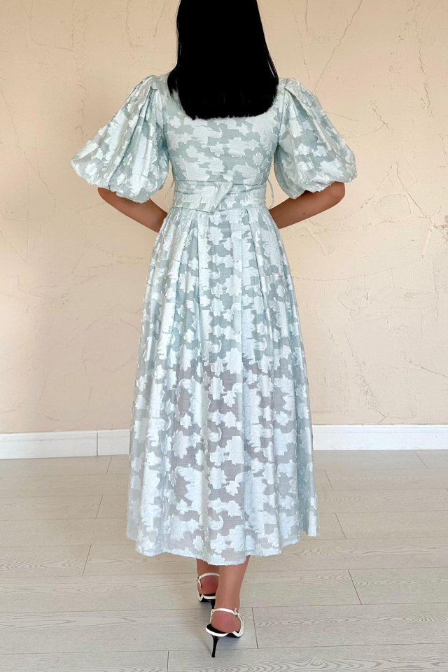 Mint Kemerli Balon Kollu Elbise