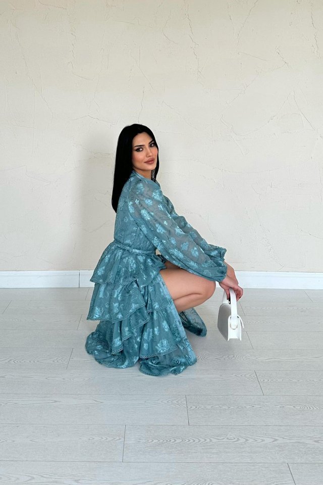Mint Valonlu Şeritli Kat Kat Elbise