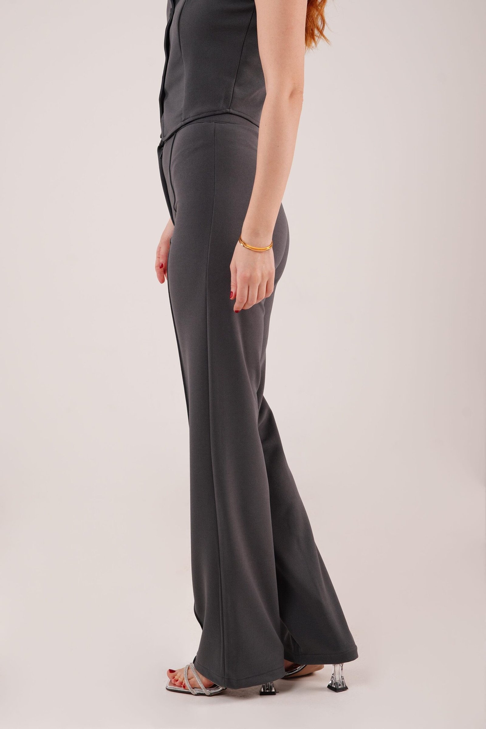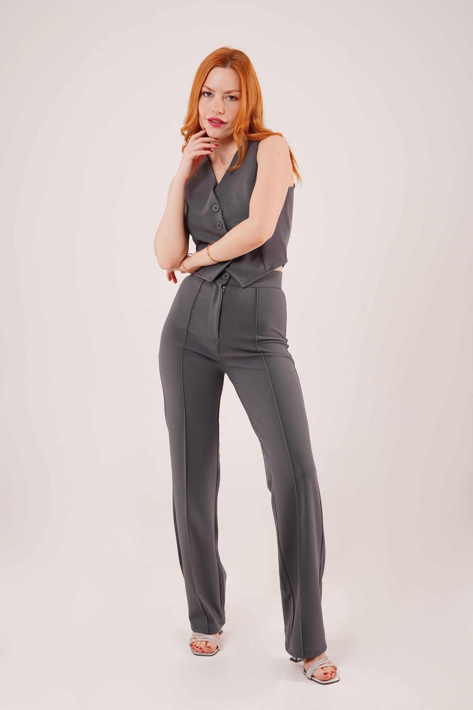 Ön Dikiş Detaylı Tek Düğme Gri Pantolon