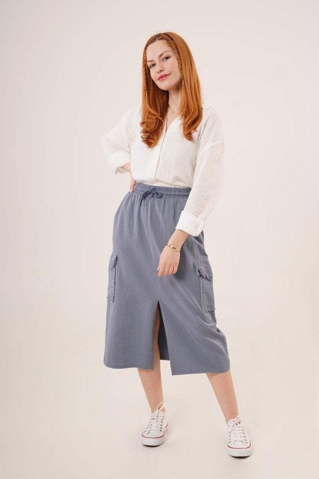 Ön Yırtmaçlı Cep Detaylı İndigo Etek
