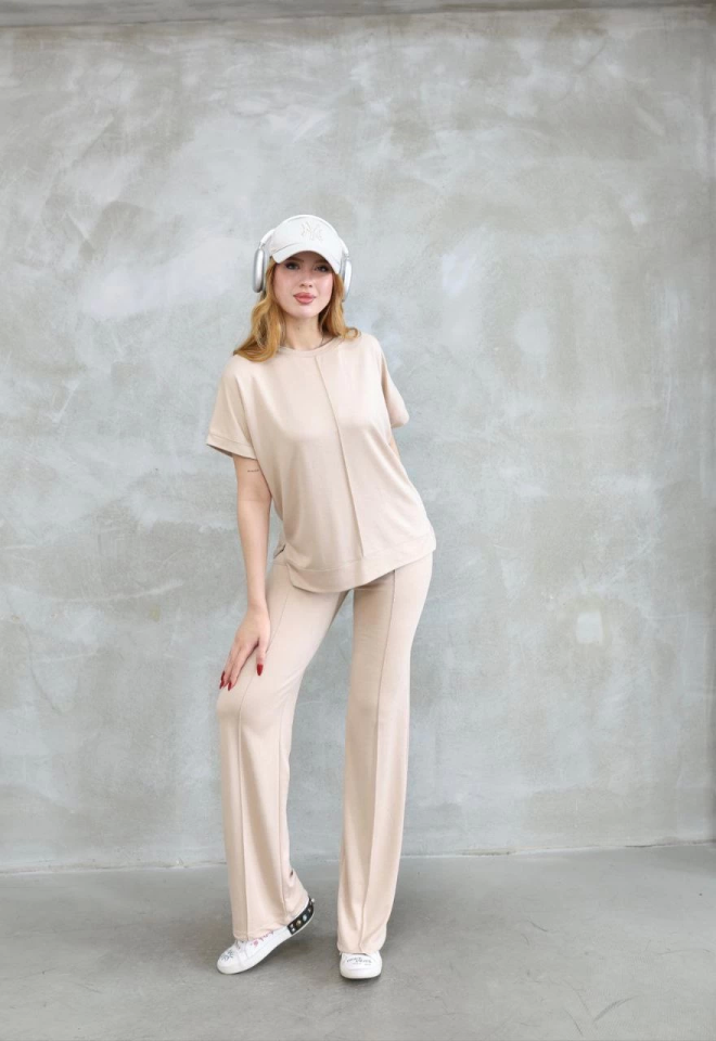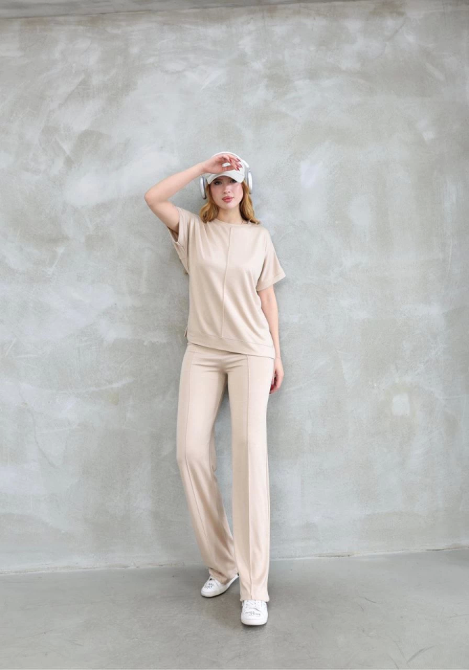 Osy Modal Yumuşak Dokulu Kumaş Bisiklet Yaka Kısa Kollu Takım – Bej