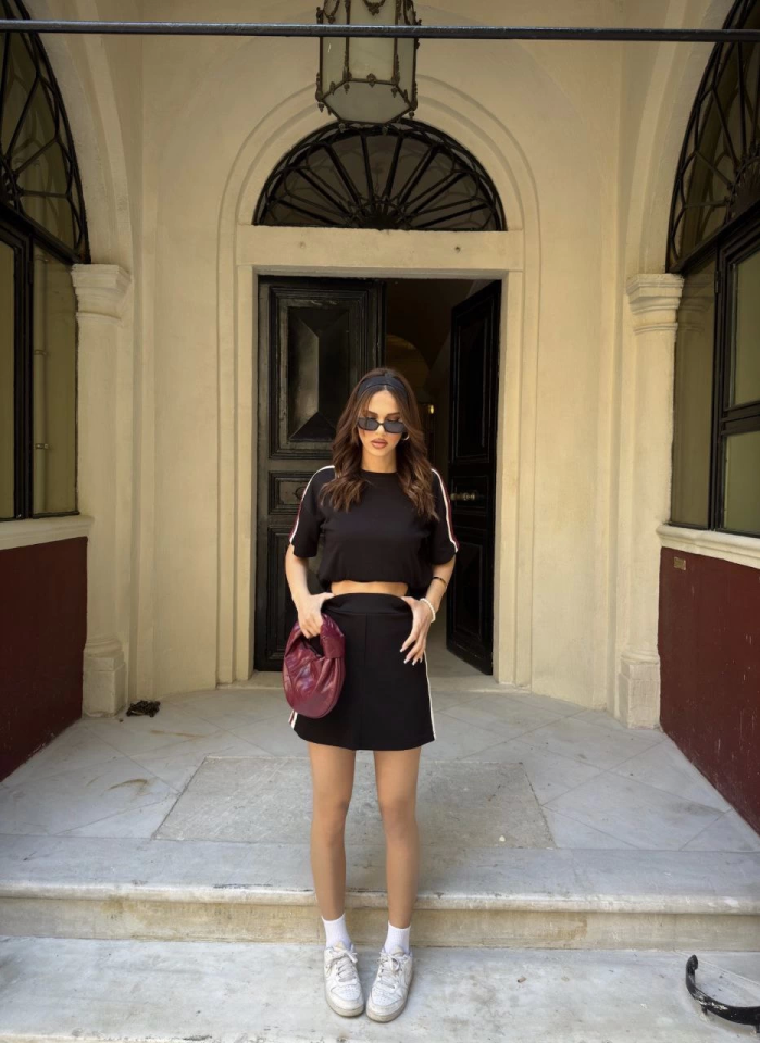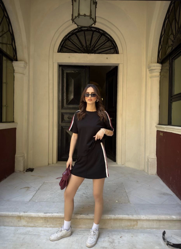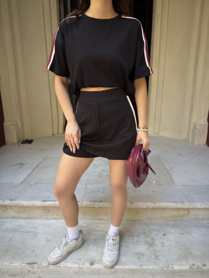 Osy Modal Yumuşak Dokulu Kumaş Parçalı Bisiklet Yaka T-shirt Mini Şortlu Etek İkili Takım – Siyah