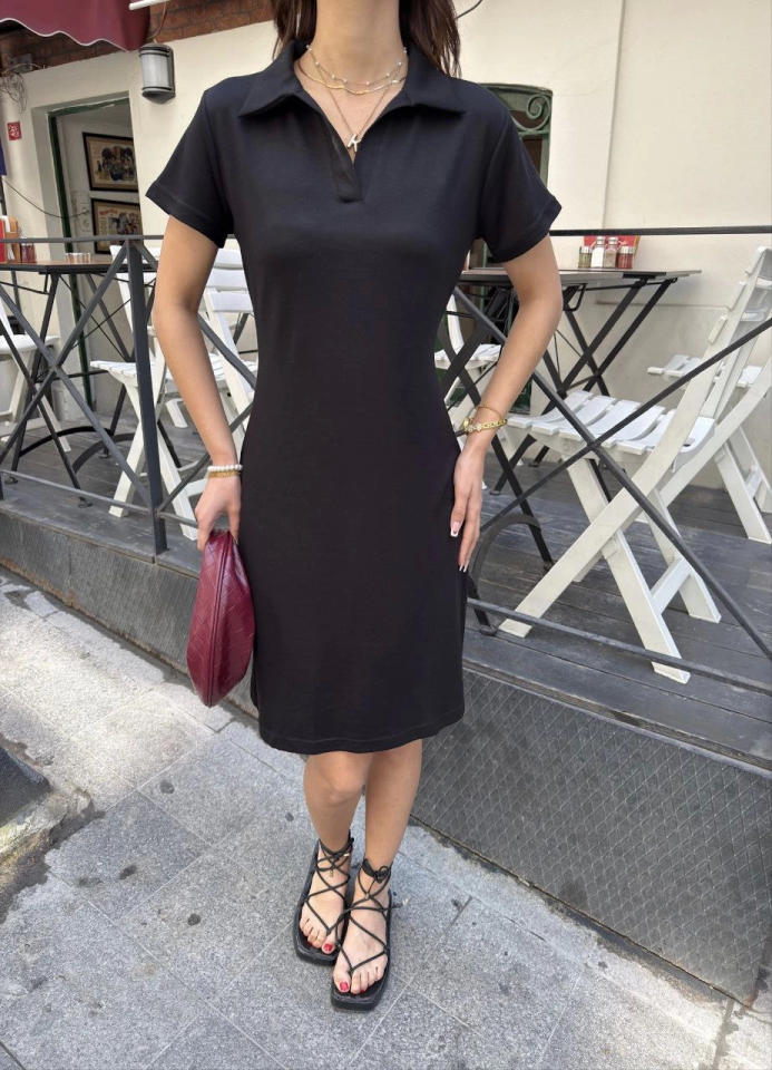 Osy Modal Yumuşak Dokulu Kumaş Yakalı Kısa Kollu Elbise – Siyah