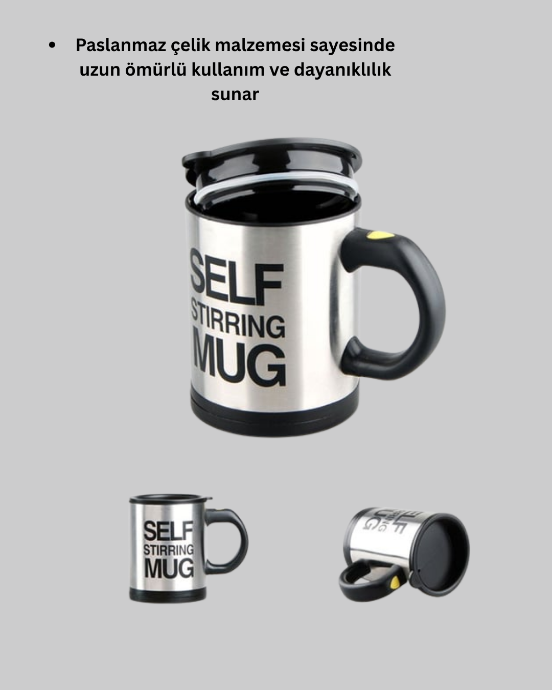 Günlük yaşamınızı kolaylaştıran otomatik karıştırma özellikli akıllı kupa, içecek hazırlama deneyimini daha hızlı, pratik ve eğlenceli hale getiriyor. Yüksek kaliteli paslanmaz çelik malzemesi, uzun ömürlü kullanım sağlarken ısı yalıtımlı yapısı sayesinde içeceğinizi ideal sıcaklıkta tutar.Sadece tek bir tuşla çalışan kendi kendini karıştıran mekanizma, toz kahve, süt, şeker veya protein tozlarını homojen bir şekilde karıştırır. Böylece topaklanma olmadan pürüzsüz içecekler hazırlarsınız. Şarjlı veya pilli sistemle çalışan motor, sessiz ve etkili bir karıştırma gücü sunar.ofis, okul veya seyahat gibi her ortamda tarzınızı ön plana çıkarır. Ergonomik sap yapısı, elde rahat tutuş sağlar. Temizliği oldukça kolaydır; kapağı ve iç haznesi çıkarılarak kolayca yıkanabilir.İçeceklerinizi karıştırırken zaman kaybetmek istemeyenler için mükemmel bir yardımcı olan bu kupa, modern yaşamın vazgeçilmez bir aksesuarı haline gelir.Günün her anında kahve, çay, enerji içeceği veya shake’lerinizi saniyeler içinde hazırlayın – sıcaklığını uzun süre koruyarak keyifle için.