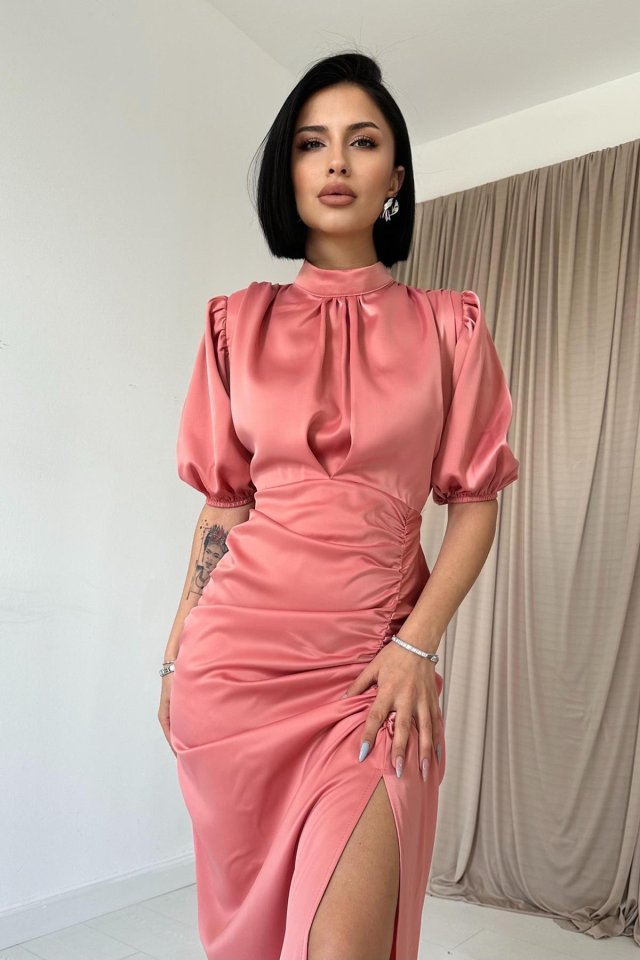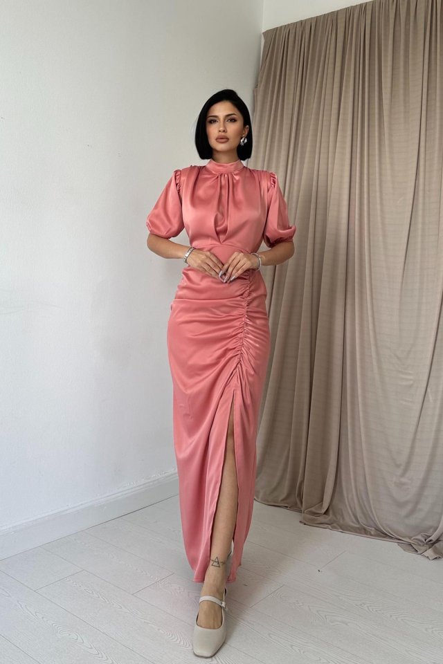 Pudra Büzgülü Saten Elbise