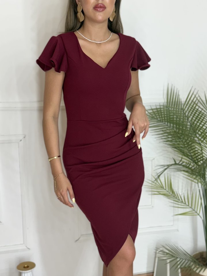 QKadın Kısa Kollu Kalp Yaka Yanlardan Büzgü Detay Midi Janjan Krep Elbise