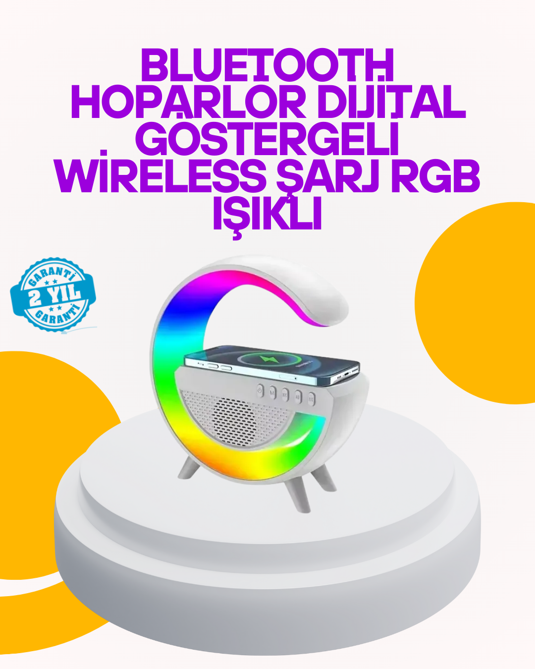 Kablosuz şarj fonksiyonu ve şık tasarımıyla öne çıkan bu LED atmosfer lambası, yaşam alanınıza hem estetik hem de işlevsellik kazandırır. 15W hızlı şarj desteği,  uyumlu telefonlarınızı kısa sürede kablosuz olarak şarj etmenize imkan tanır. Entegre 1200 mAh batarya ile elektrik bağlantısı olmadan da kullanılabilir, böylece istediğiniz yere kolayca taşıyabilirsiniz.Cihazın 13 farklı renkli atmosfer ışığı modu bulunur. Bu modlar arasında dinamik geçişler ve sabit renk seçenekleri vardır, böylece ister romantik bir akşam, ister enerjik bir çalışma ortamı oluşturabilirsiniz. 7 farklı beyaz gürültü (deniz dalgaları, yağmur, rüzgar, kuş sesi vb.) modu, gevşemenizi ve kaliteli uykuya geçmenizi kolaylaştırır.LED ekran, saati net şekilde görmenizi sağlar ve alarm fonksiyonu ile sabahları zamanında uyanmanıza yardımcı olur. Dokunmatik kontrol sistemi, ışık parlaklığını ve renkleri kolayca ayarlamanızı sağlar.Modern tasarımı sayesinde yatak odası, ofis veya salon gibi her ortamda dekoratif bir unsur olarak da kullanılabilir. Doğum günü, yılbaşı veya ev hediyesi olarak da ideal bir tercihtir. Fonksiyonelliği ve zarif görünümüyle hem kendi kullanımınız hem de sevdikleriniz için mükemmel bir üründür.