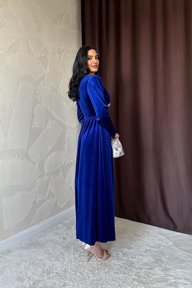 Saks Göğüs Altı Taşlı Elbise